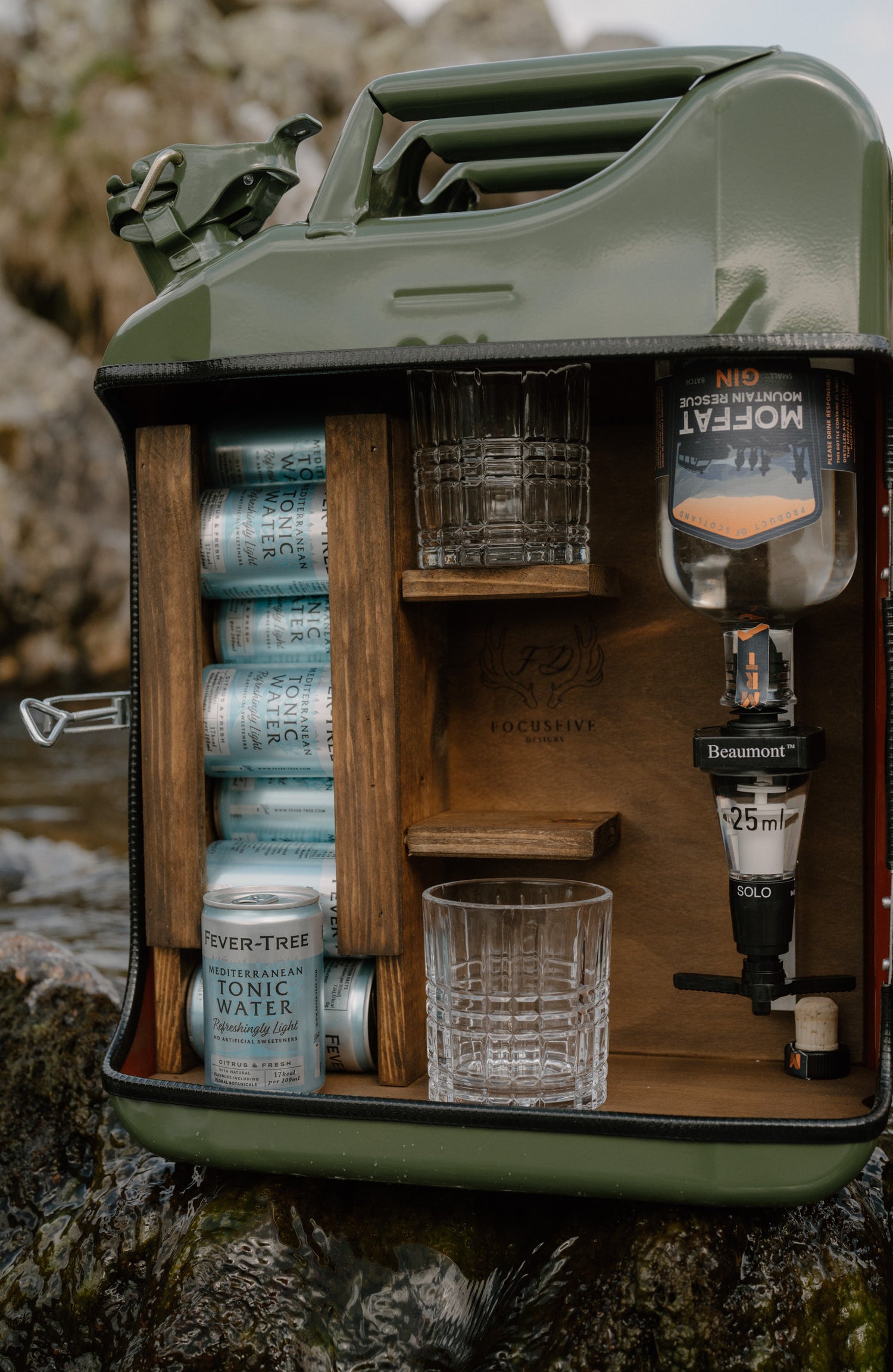 Take your adventures to the next level with the JerryBar™, a rugged yet stylish portable mini bar made from durable steel jerry cans. Crafted with a focus on quality and practicality, it’s the perfect companion for any outdoor gathering.